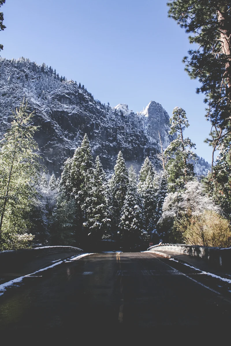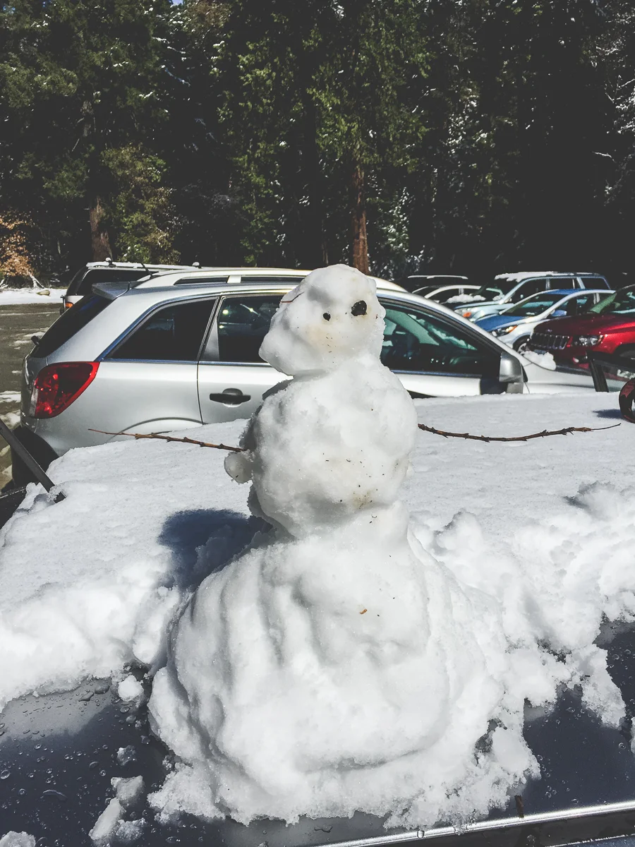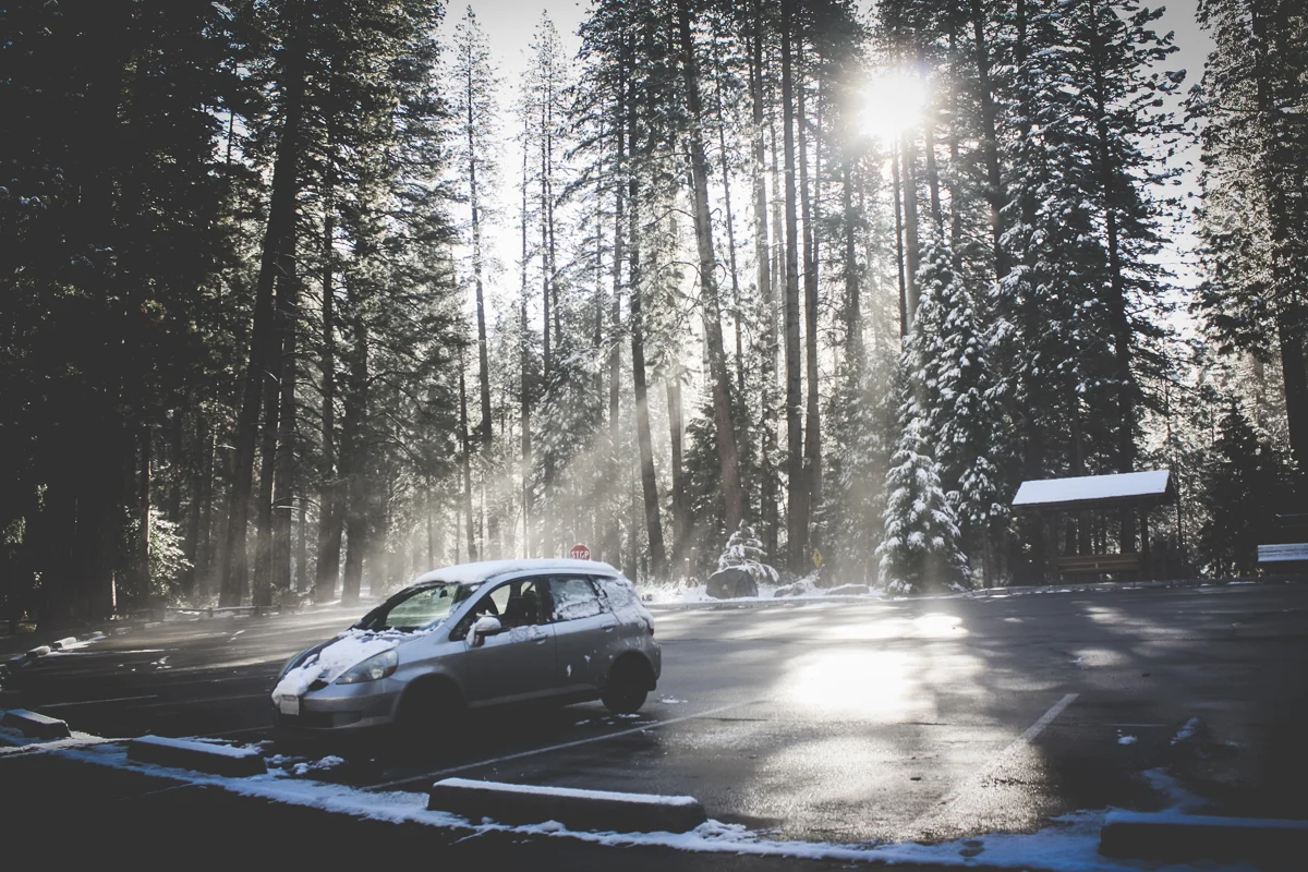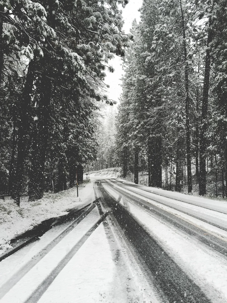 We stopped at the market to grab some essentials and thought it would be prudent to have a pair of snow-chains in the event that the California Highway Patrol was checking for them. So, we bought a bag of cable chains and threw them into the trunk. The plan was to leave them untouched and return them on the drive home—devilish, I know. Well stocked and eager, we charged up the hill towards Yosemite. As we grew in elevation, the rain began to intensify. Suddenly though, it stopped—it was now snowing!