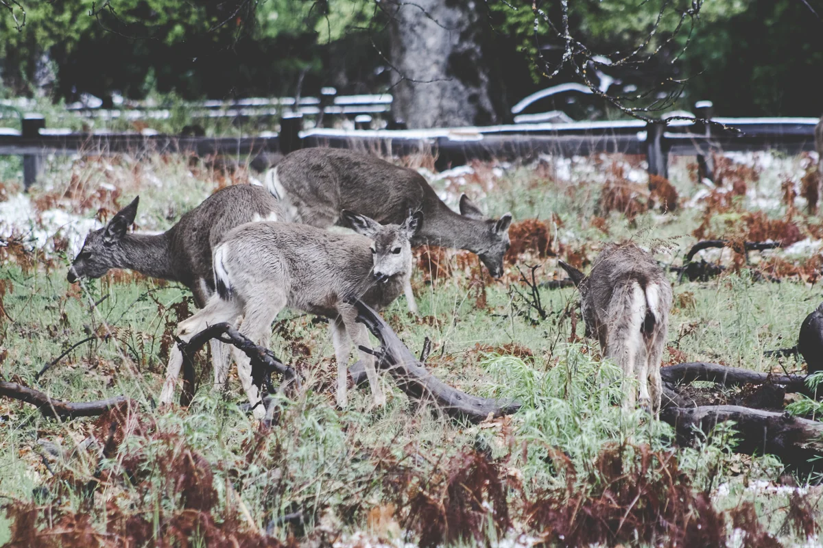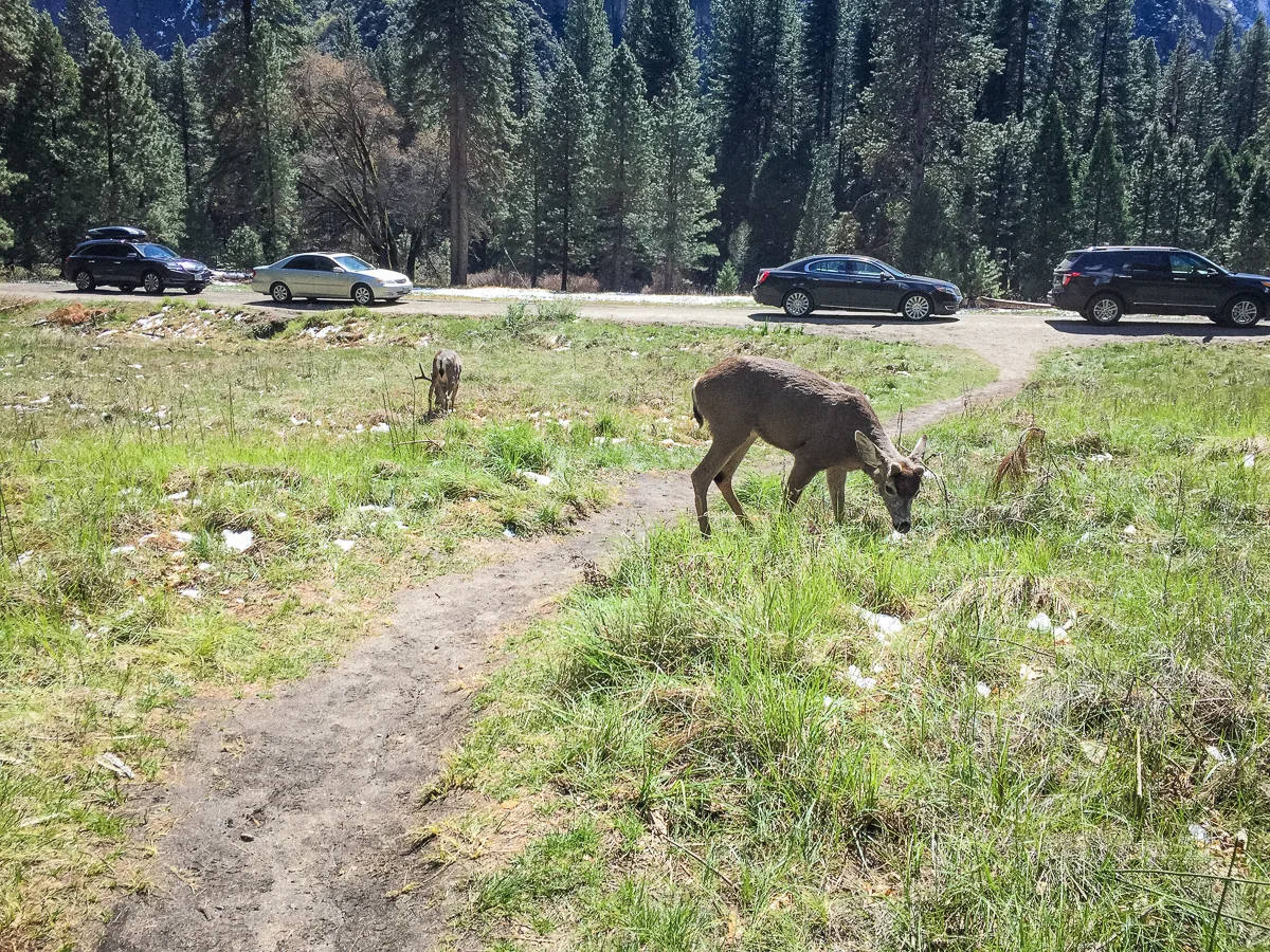 Driving around the valley floor, we were pleased to see that the snow still dusted the ground and clung to the cliffs above. Clouds of mist slowly hovered above and deer, undisturbed, grazed below. It was quite a scene.