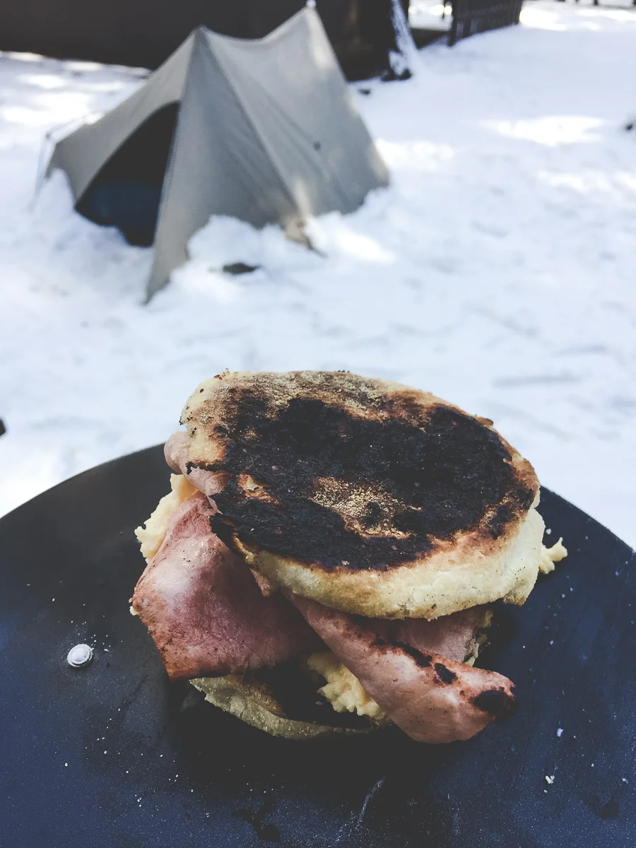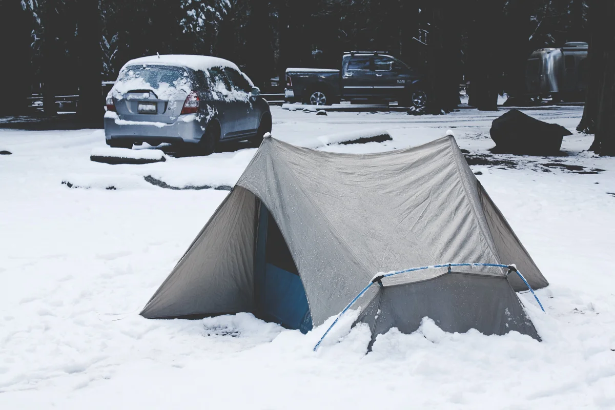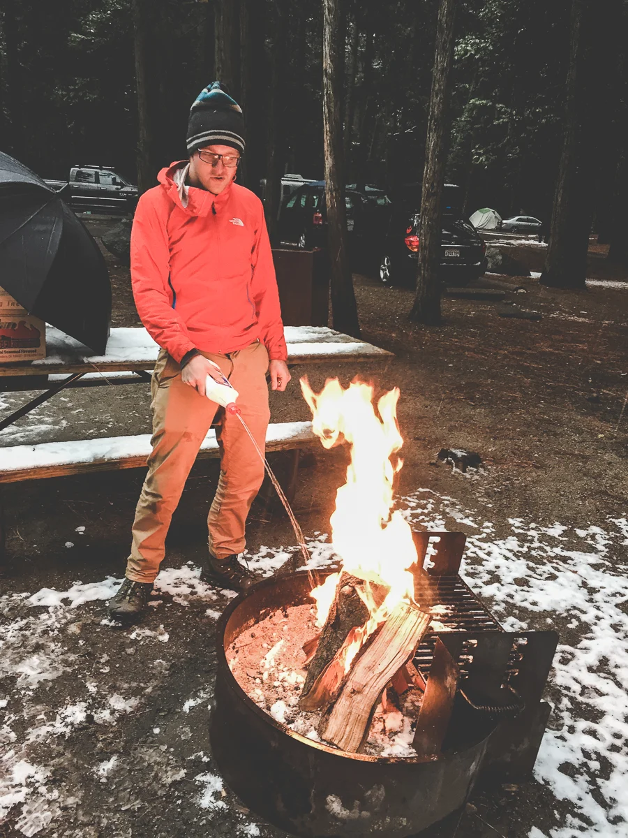 The next morning, I woke up to eerie silence of a snowy campground. “Man last night sucked!”, I thought. I had woken up several times, had stomach problems, and at one point, I just sat in the bathroom for no reason other than to warm up. We had forgotten to bring a sleeping bag rated for the cold and had to improvise with blankets; I forgot a pillow and had to use an IKEA seat cushion, folded into thirds. Throughout the night, I kept on looking at my car and I considered starting it to run the heater, but that felt like the ultimate failure to me, so I resisted.