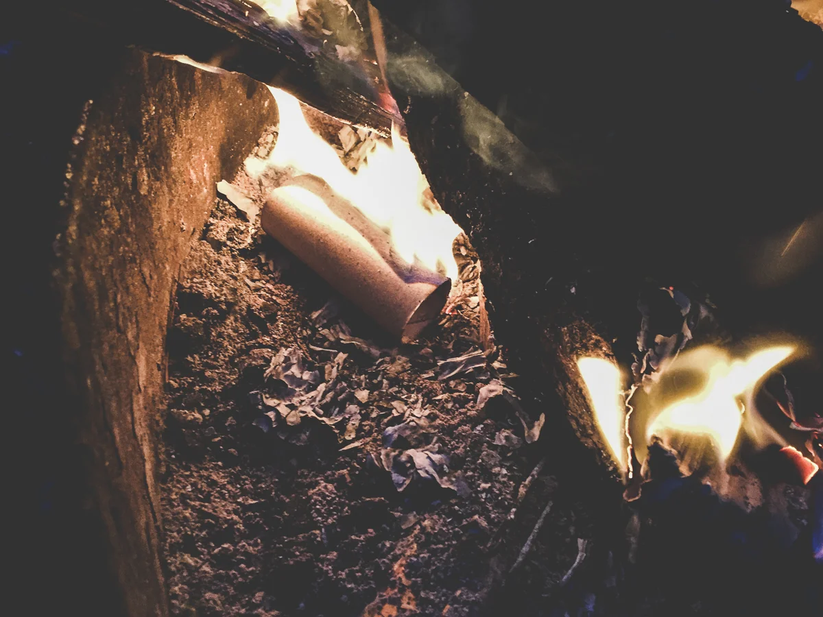 We looked around for anything that would help. All of the twigs and pine needles were wet from snow. The cardboard box the firewood came in lasted just a few minutes. Then we thought to check the bathroom.