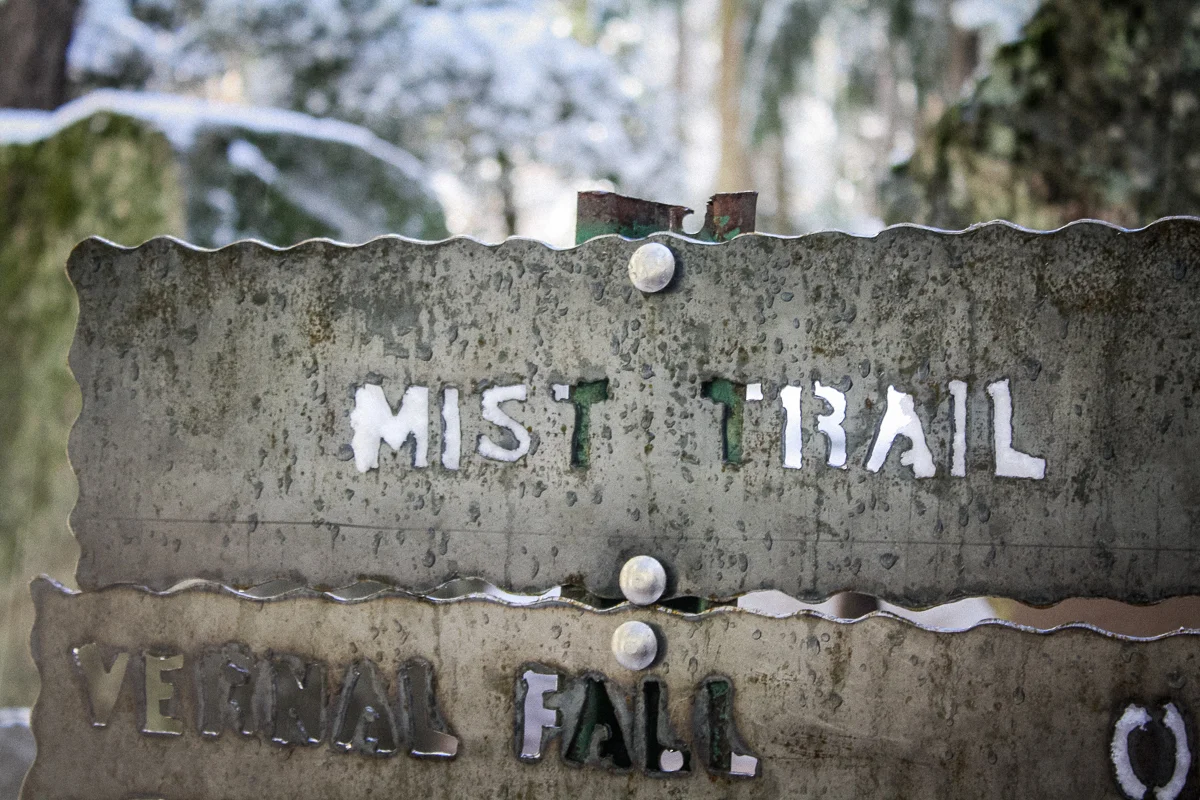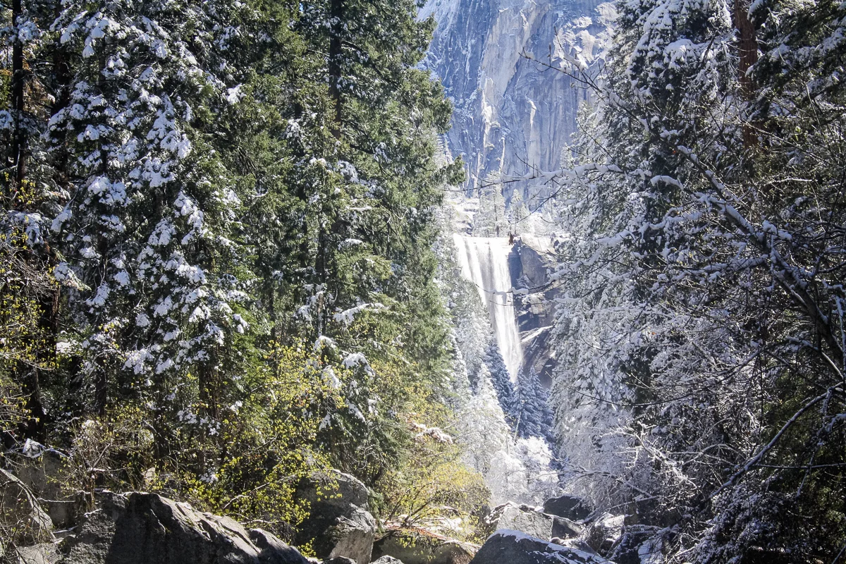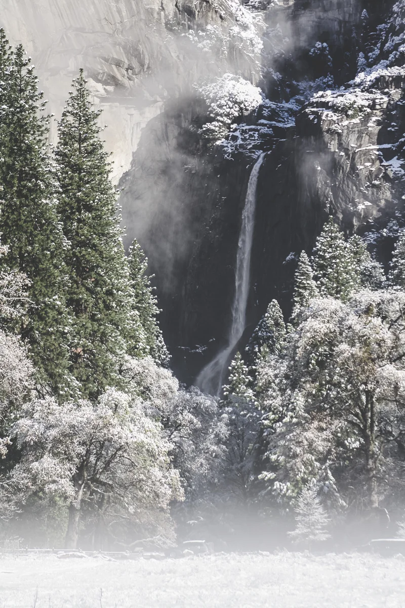 Happy as we were to stretch and take photos, we were just as happy to return to the car for a quick warm up. We saw that Yosemite Falls was just up ahead and we wanted to see the icon, replenished by fresh snow. Parking nearby, we took the short, quarter-mile trek to the base of the Lower Yosemite Falls. The upper-falls were often out-of-view but would occasionally emerge from behind the mist, ominously looming overhead.