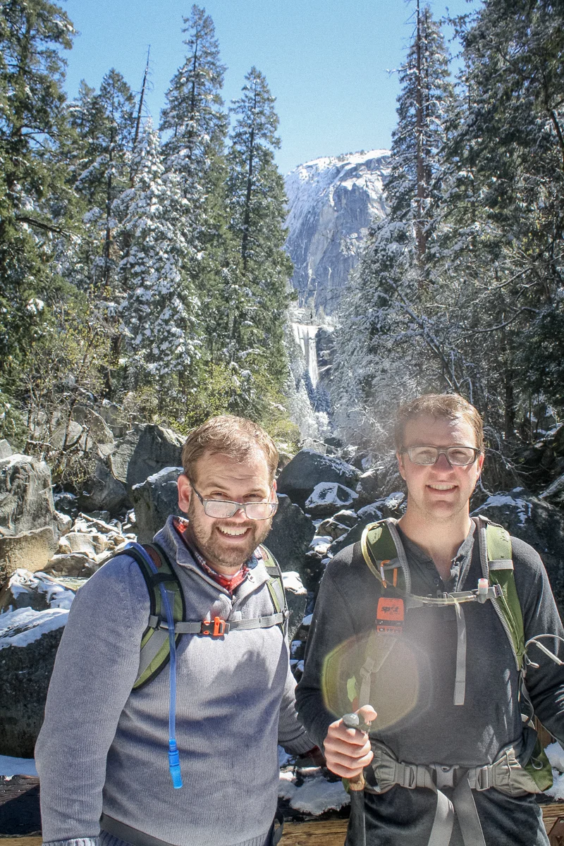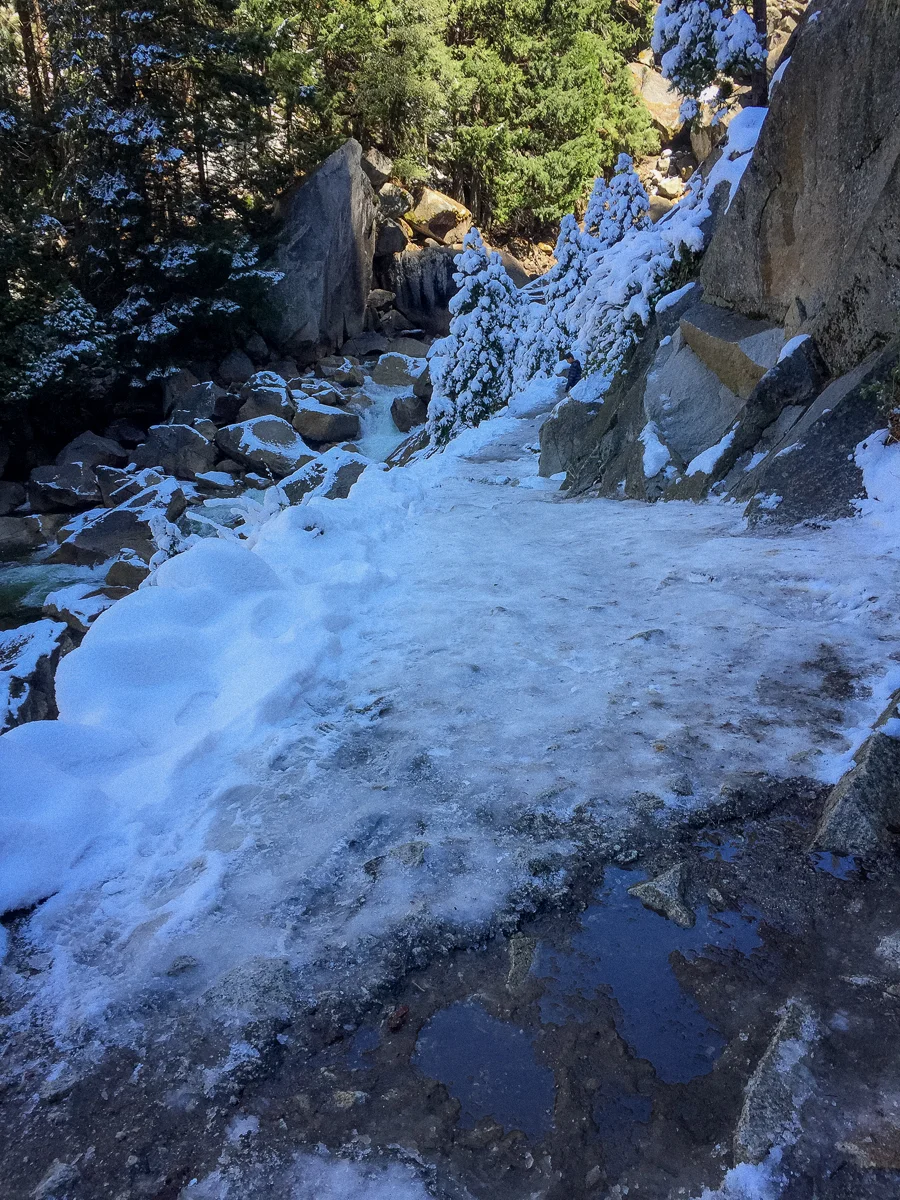 This grew problematic as the final approach to Vernal Falls was a series of snowy ramps and a long, granite staircase. With the snow trampled into ice, each step needed to be carefully taken. I imagined slipping and cracking my head on a step or sliding off of the trail entirely. All of the hikers took turns allowing one another to pass. Most seemed aware of how dangerous it was.
