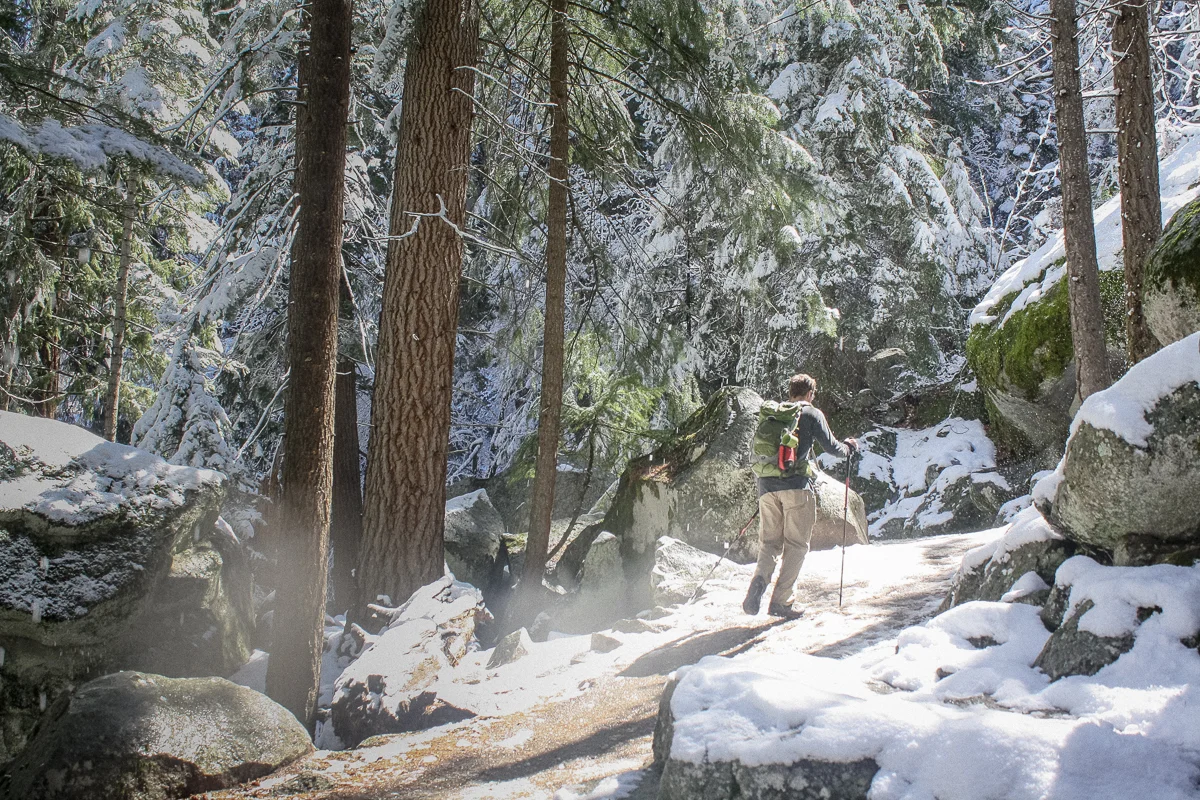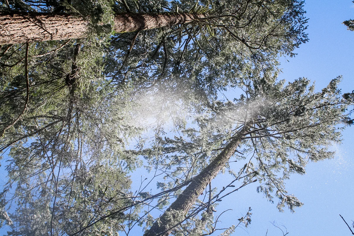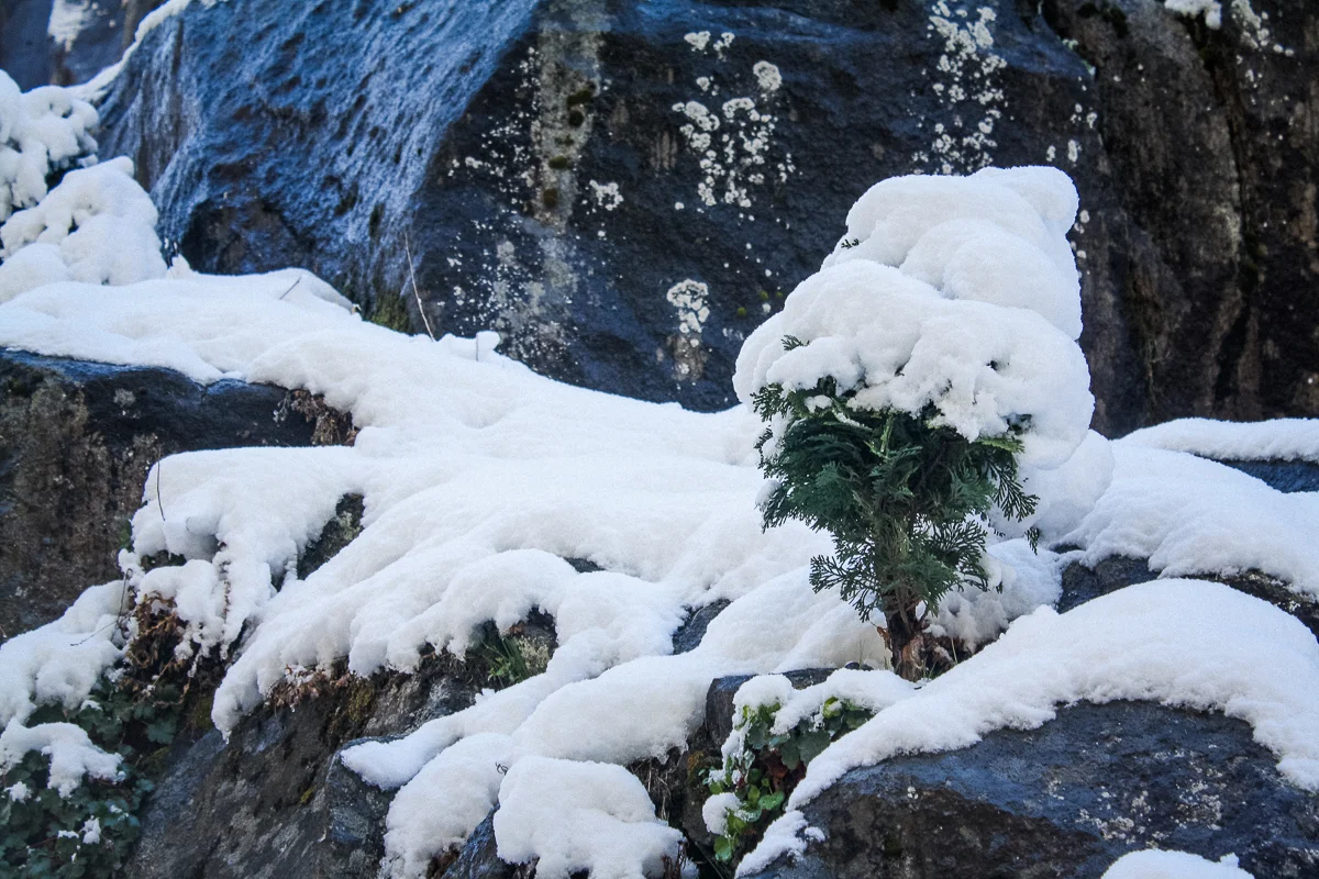 On the bright, northern rock faces, the signs of snowmelt had already begun. The white trees were giving way to a bright green and occasionally, I would get rained on by snow that had lost its structure and fallen from the tree branches above. But in the shadows of the cliffs, the snow remained, unconcerned with the rising sun.