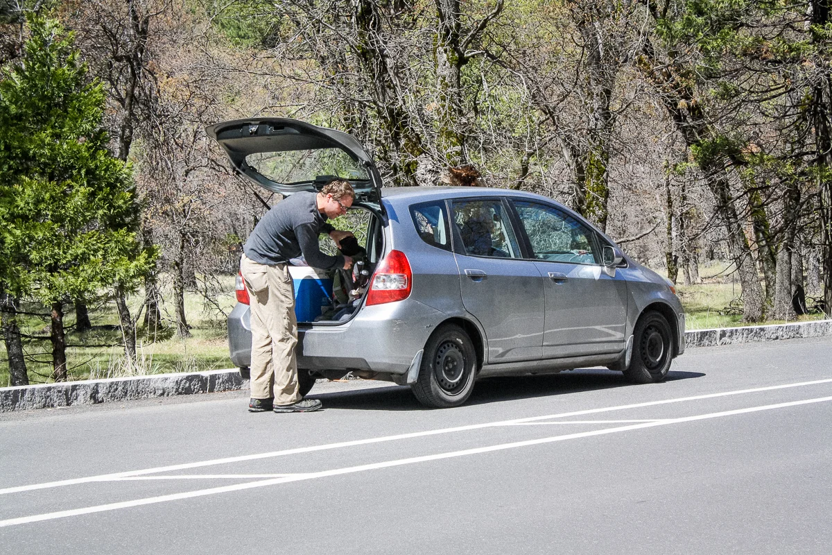 Now with a bag of two cable-chains in tow, we set out back up the hill—but our woes would not end there. We installed the chains and confidently continued up the road, chugging away like a train as each cable bounced between the road and the tire. We were only one mile further when we were stopped by a row of cars.