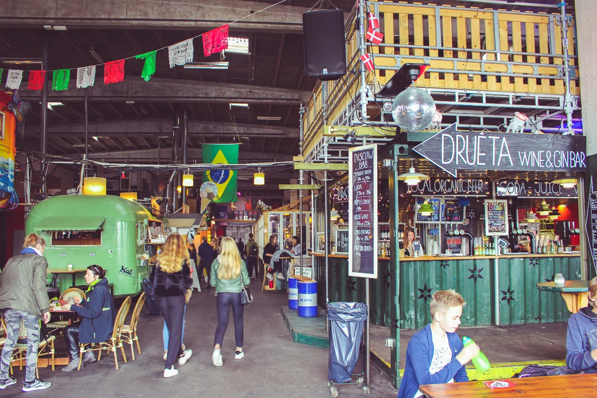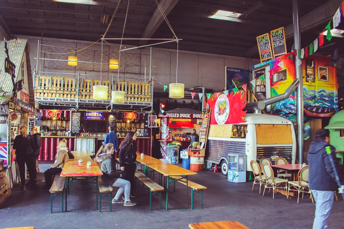 Either way, once taking our rest, we laced up and continued to Papirøen, or “paper island”. The island appears in its former, industrial shell but now home to more artistic endeavors, including a hall called Copenhagen Street Food. The hall is a building packed with shipping pallets and street trucks catering food from all across the world. The area is remarkably trendy and began to fill up quickly.