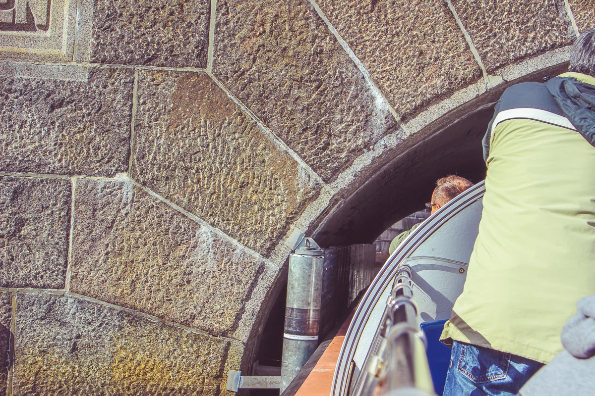 As we proceeded through these inner canals, we also threaded under a few bridges, with clearances that got tighter and tighter. Our flustered tour guide would have to bark instructions to duck or sit down, trying dearly to warn passengers of the impending head-chopper clearances.