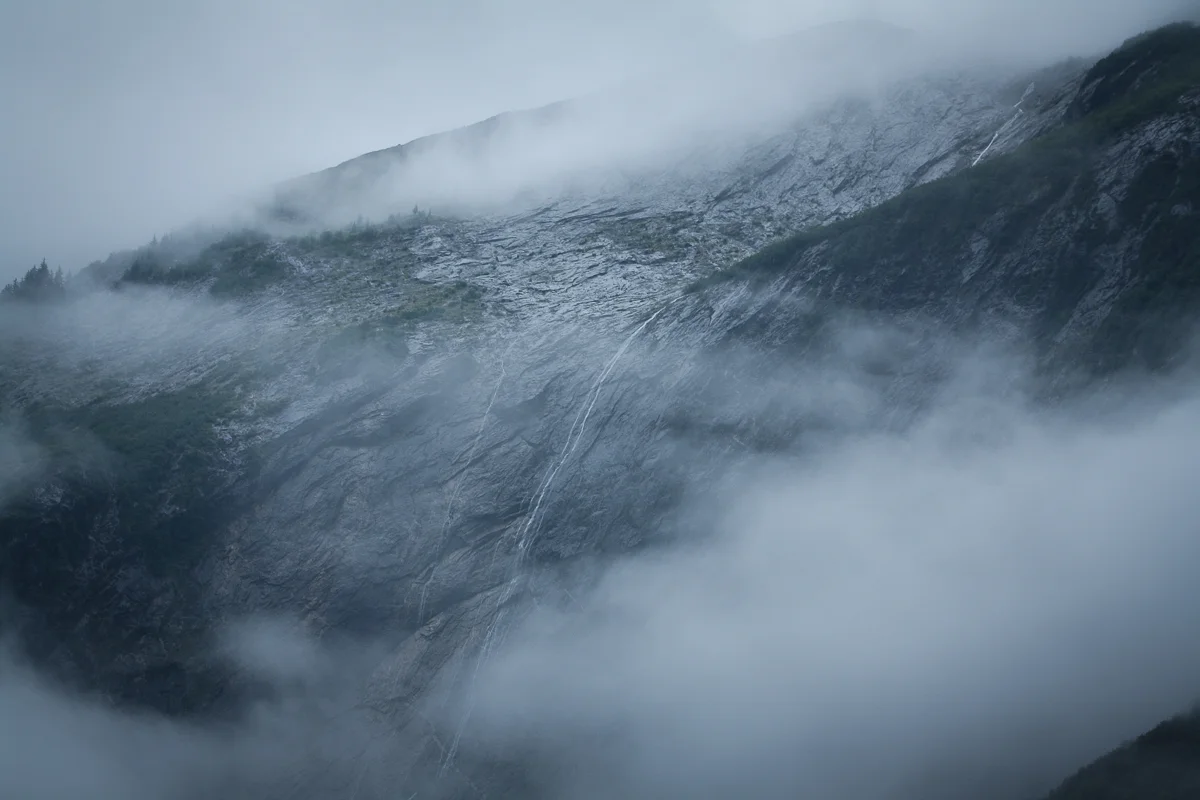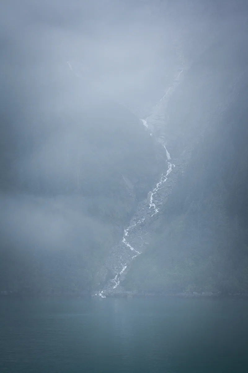Though observing from the highest point on the ship, we felt indescribably tiny as the solid, rock walls of the fjord narrowed on each side of the ship. The low, heavy clouds hovering within the cliffs only added to this effect by obscuring the true height of each ridge.