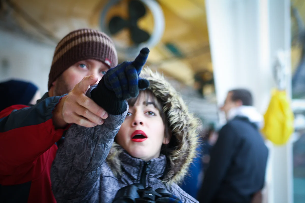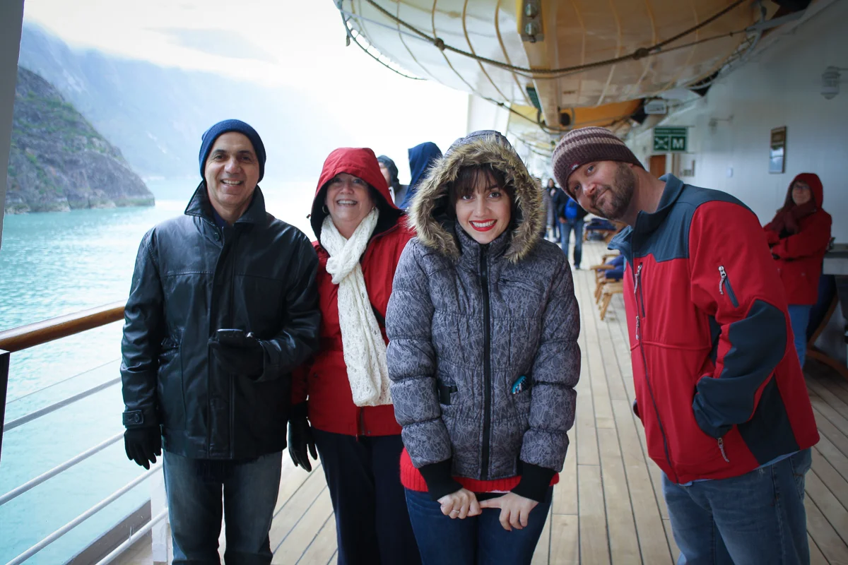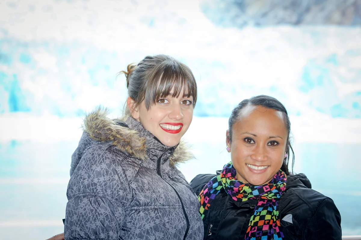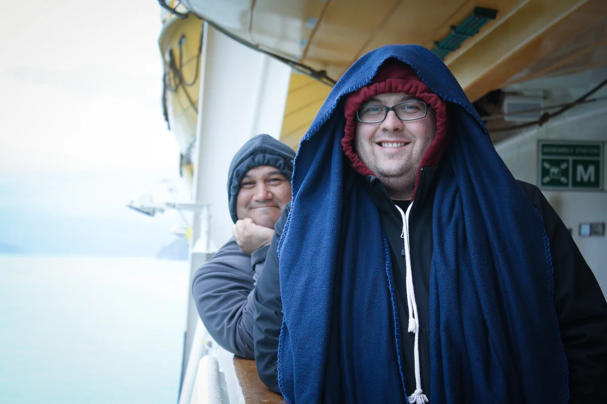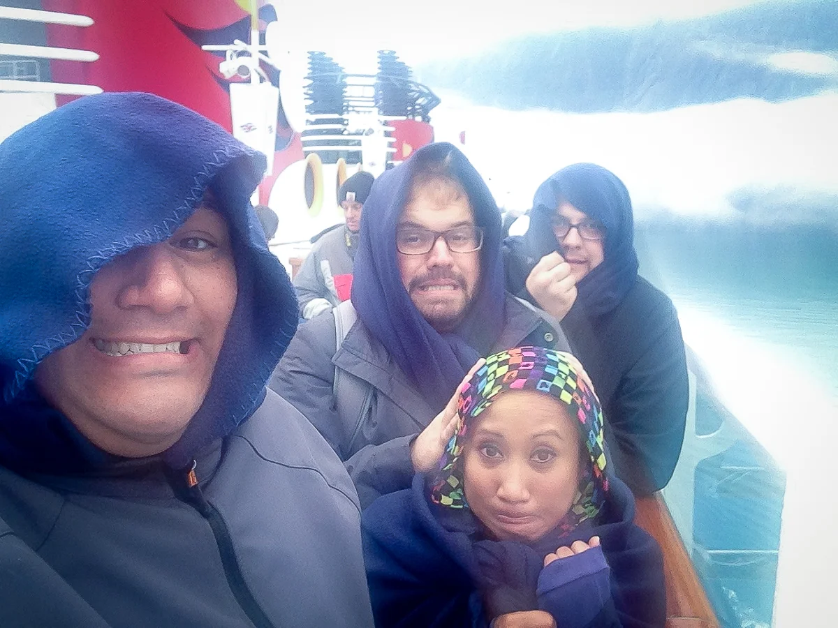 Naturally, everyone else also had the idea of heading to the top deck and precious real-estate along the edge of the ship was hard to come by. Luckily, Chuck and Chris found a spot between a towel-box and the railing, buying our group a little nook to view from. Our view was superb but the open deck introduced us to our first truly cold Alaskan weather. Lined up in headscarves and by height, it wasn't long at all before we began to look like a set of Russian nesting dolls!